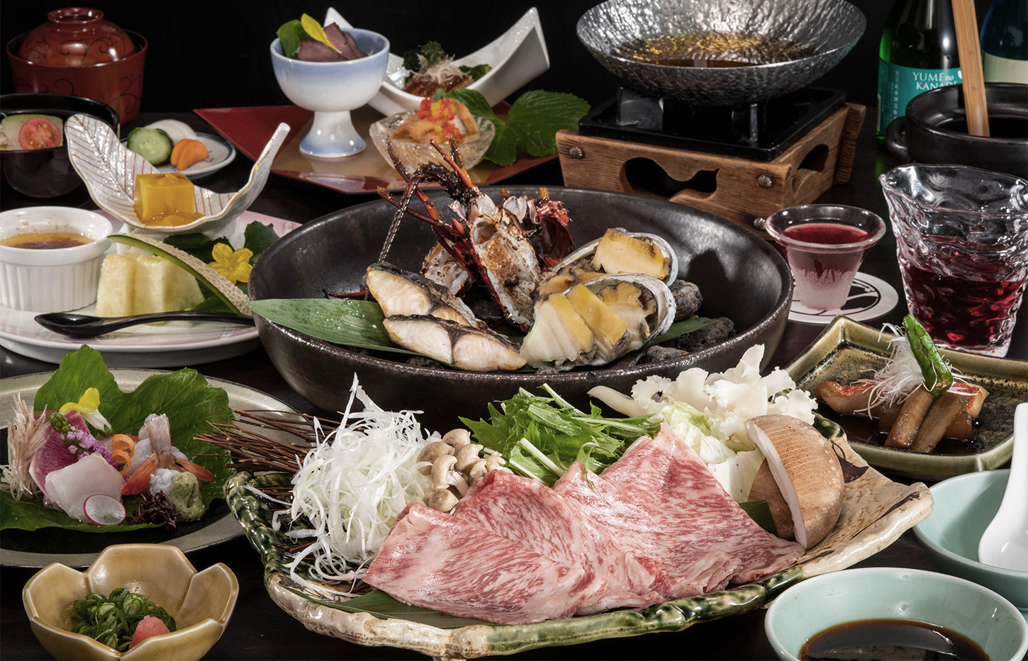 天遊磯会席「銀朱-ぎんしゅ」は、当宿でも最も贅沢なお料理です。 基本のお料理「琥珀」に、和牛のしゃぶしゃぶをお付けしたボリュームも申し分ないコースで、特別な日にも最適です。